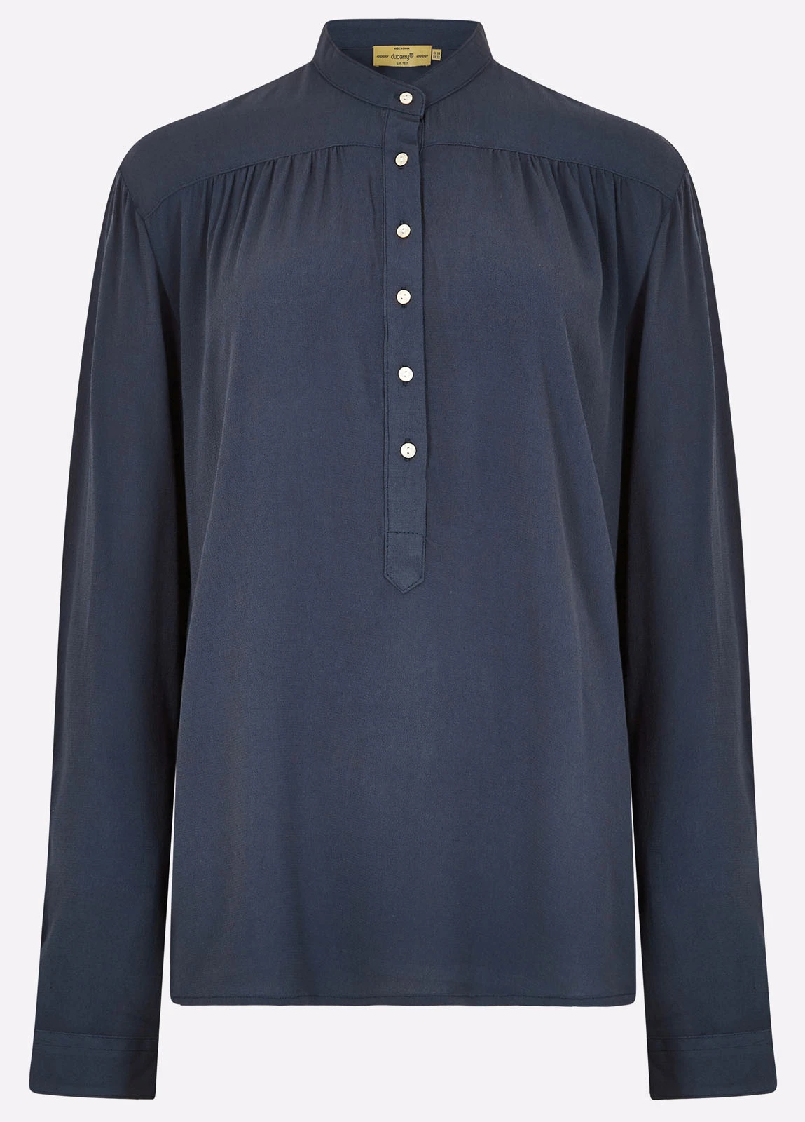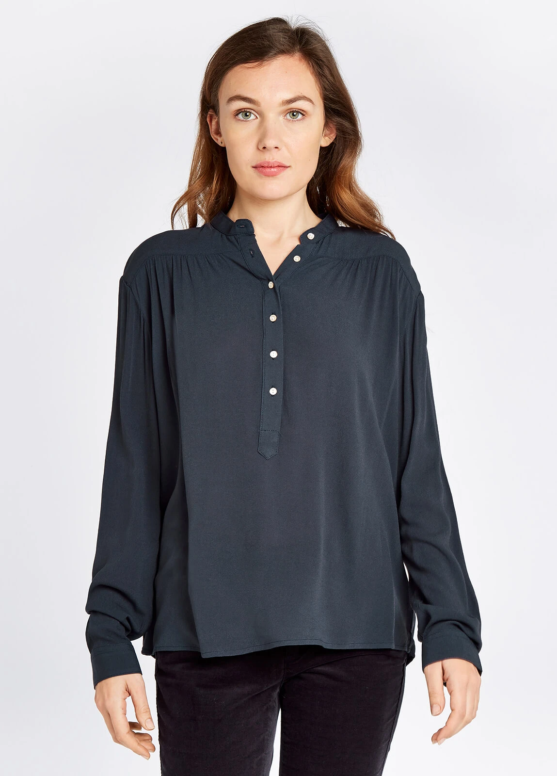 Soft, feminine and easy to wear, the Abor shirt brings a simple touch of elegance to an outfit. Gathered shirring details on the shoulder seams and back, teamed with shell buttons and material which falls beautifully, work together to elevate a casual jean look. Button up or down for day versus evening and add Dubarry Bray boots for an ideal brunch, lunch or supper out style.