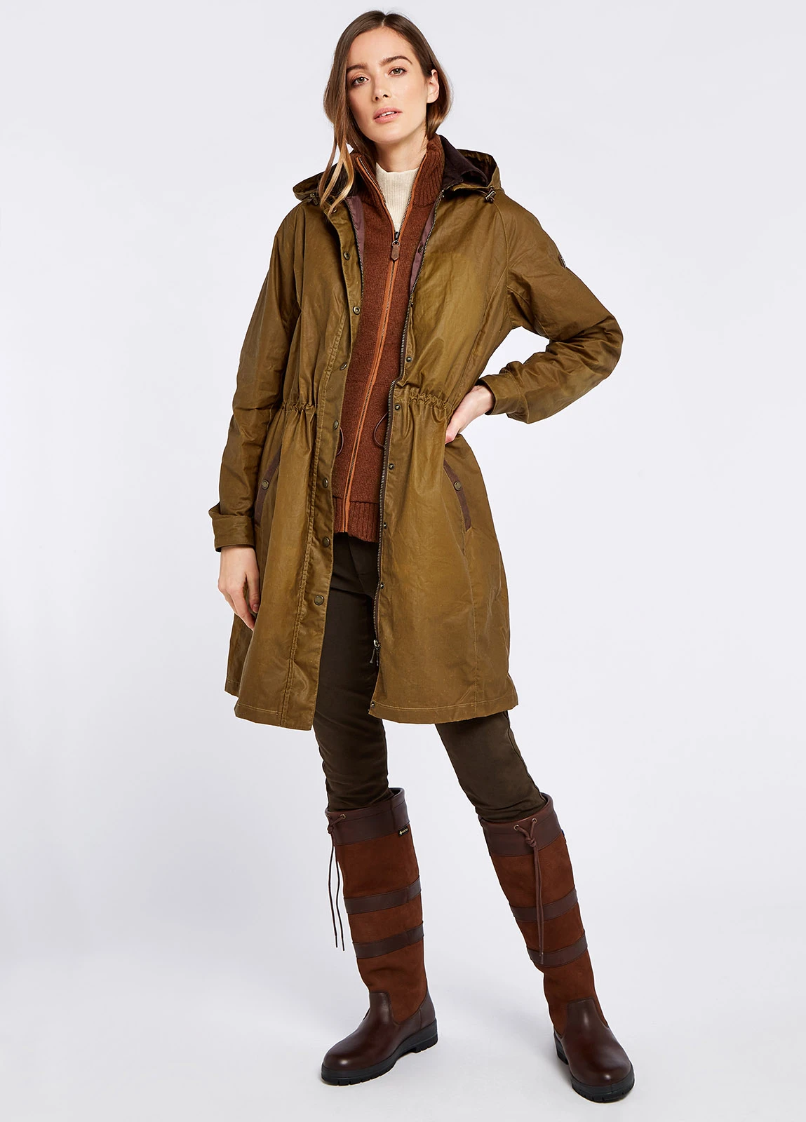 Where countryside practicality meets rural style, the Ballyvaughan is long wax cotton coat with a zip off hood that has adjustable draw string waist for your personal style. There are exterior hand warming pockets with a leather trim and an interior pocket that keeps valuables safe. The collar and cuffs have contrast colour cord and inside is a dirt resistant inner hem, so whether you’re splashing in mud from the dog walk or dancing, a Ballyvaughan and some Dubarry country boots will have you covered.