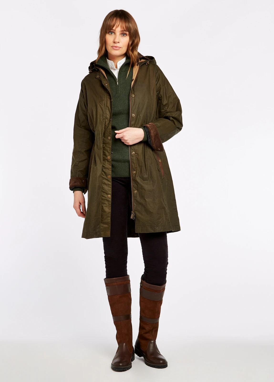Where countryside practicality meets festival chic, the Ballyvaughan is long wax cotton coat with a zip off hood that has adjustable draw string waist for your personal style. There are exterior hand warming pockets with a leather trim and an interior pocket that keeps valuables safe. The collar and cuffs have contrast colour cord and inside is a dirt resistant inner hem, so whether you’re splashing in mud from the dog walk or dancing, a Ballyvaughan and some Dubarry country boots will have you covered.