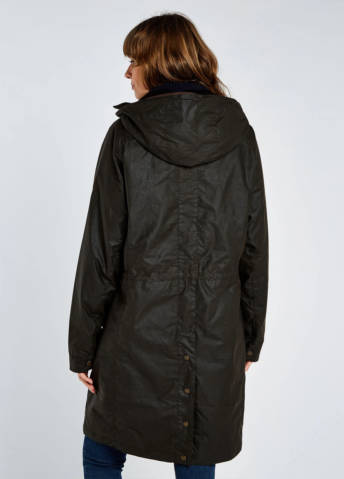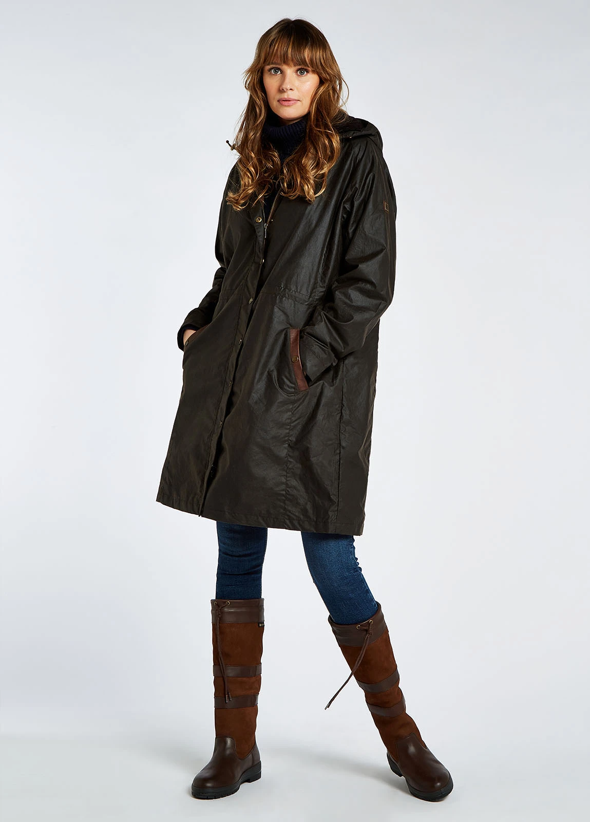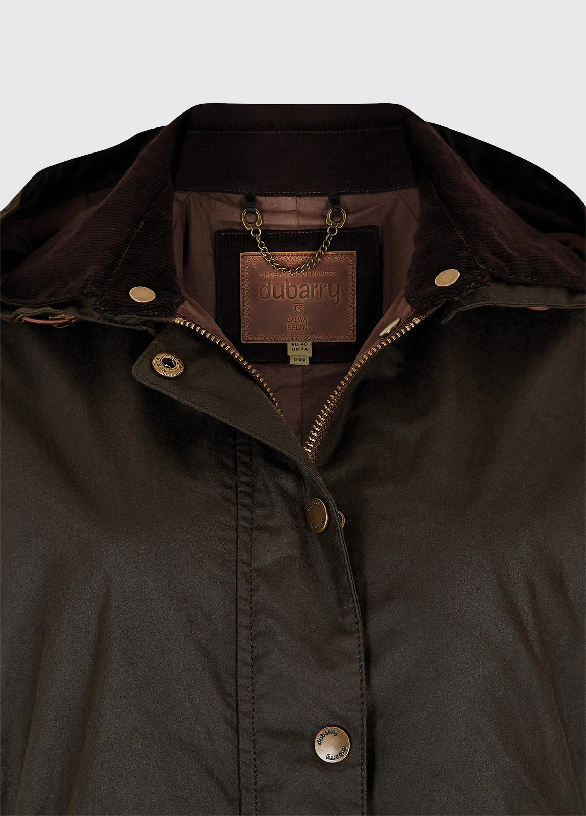 Where countryside practicality meets festival chic, the Ballyvaughan is long wax cotton coat with a zip off hood that has adjustable drawstring waist for your personal style. There are exterior hand warming pockets with a leather trim and an interior pocket that keeps valuables safe. The collar and cuffs have contrast colour cord and inside is a dirt resistant inner hem, so whether you’re splashing in mud from the dog walk or dancing, a Ballyvaughan and some Dubarry country boots will have you covered.
