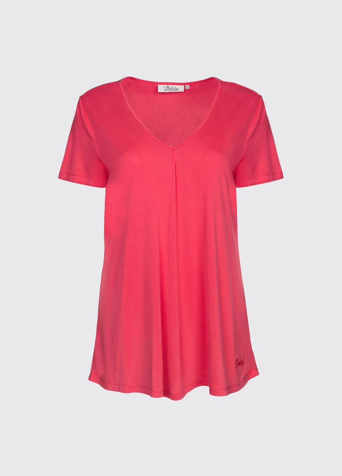 Dubarry Bellbridge Trapezze top, ultra-soft V neck short sleeved jersey top with trapeze silhouette; luxurious, weighty fabric, providing both softness and a beautiful drape. – Ultra-soft V neck short sleeved jersey top with trapeze silhouette; luxurious, weighty fabric, providing both softness and a beautiful drape. 74% Modal, 26% Polyester jersey Machine washable