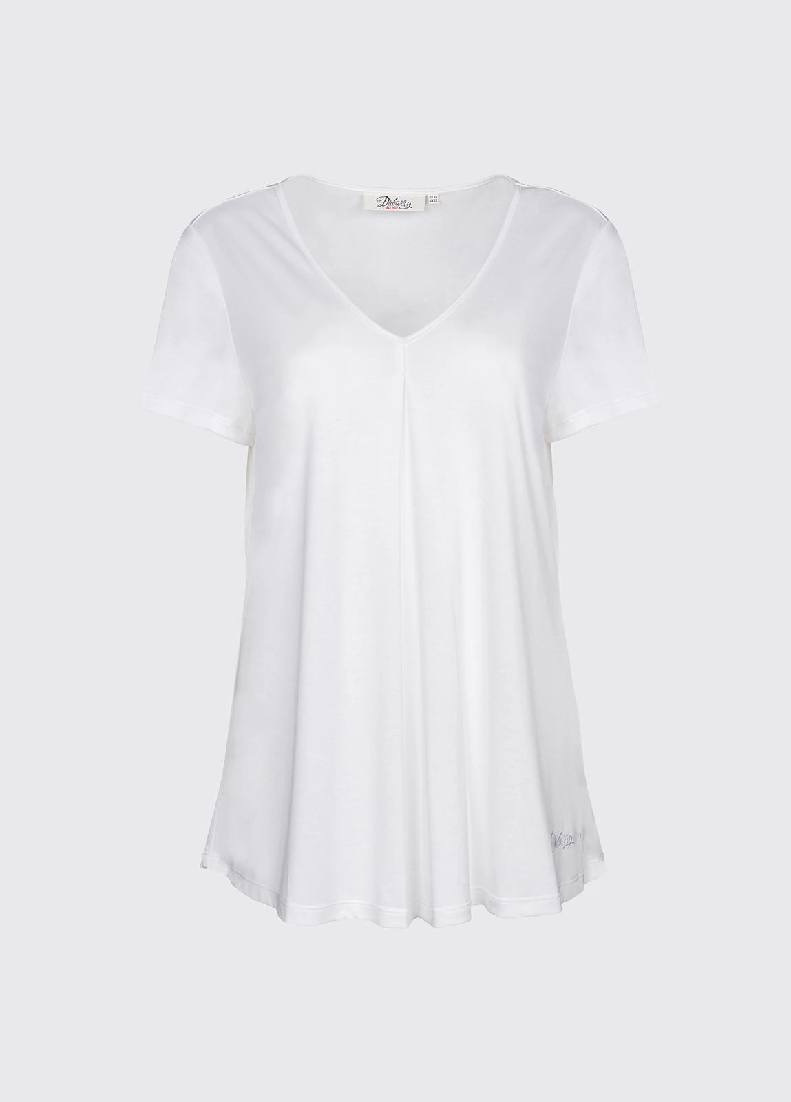 Dubarry Bellbridge Trapezze top, ultra-soft V neck short sleeved jersey top with trapeze silhouette; luxurious, weighty fabric, providing both softness and a beautiful drape. – Ultra-soft V neck short sleeved jersey top with trapeze silhouette; luxurious, weighty fabric, providing both softness and a beautiful drape. 74% Modal, 26% Polyester jersey Machine washable