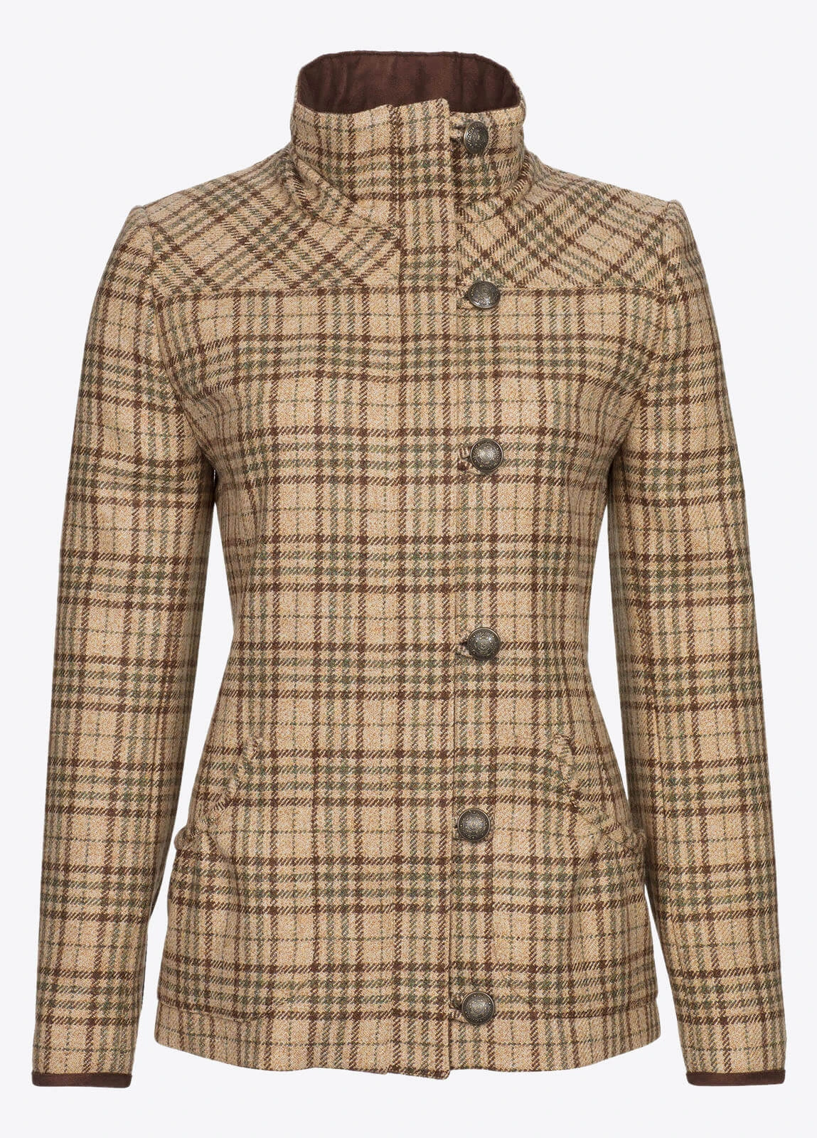 The Bracken is a smart women’s tweed sporting jacket available in a variety of tweed colours. A Teflon coated 100% wool exterior repels showers and a storm flap fastened off center with eye-catching cast metal buttons hides a full-length zip which extends to the stand-up collar, to keep out chills. A great match with jeans and Dubarry country boots the Bracken is a very wearable jacket with deep gathered pockets that you’ll find being used day in day out.