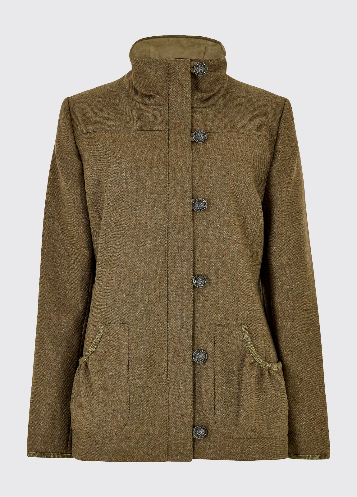 The Bracken is a smart women’s tweed sporting jacket available in a variety of tweed colours. A Teflon coated 100% wool exterior repels showers and a storm flap fastened off center with eye-catching cast metal buttons hides a full-length zip which extends to the stand-up collar, to keep out chills. A great match with jeans and Dubarry country boots the Bracken is a very wearable jacket with deep gathered pockets that you’ll find being used day in day out.