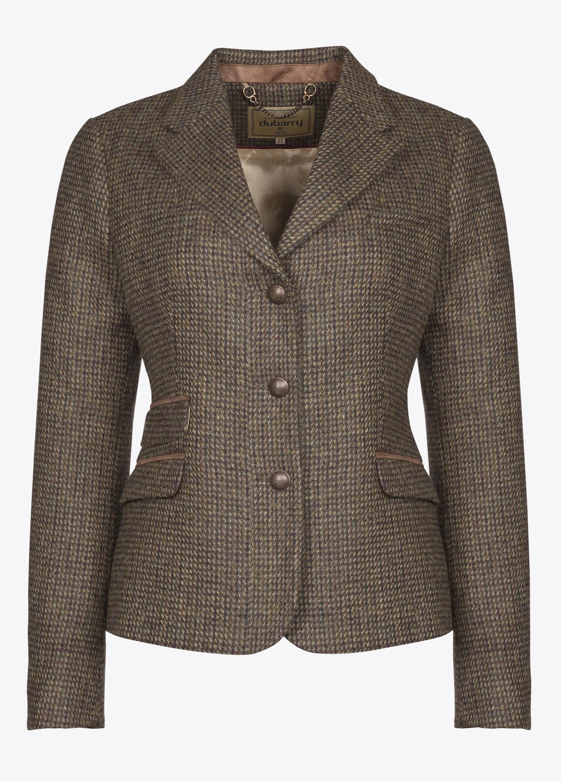 The Buttercup is a wonderfully useful jacket with a short, equestrian inspired shape giving a neat silhouette. A variety of striking 100% wool tweeds, with eye-catching buttons, work seamlessly over the Dubarry range of tailored shirts, suiting both workwear and country pursuits alike. Team with jeans, knitwear and Galway country boots for instant added finesse or a Dubarry tweed skirt and Limerick boots to complete a sophisticated combination.