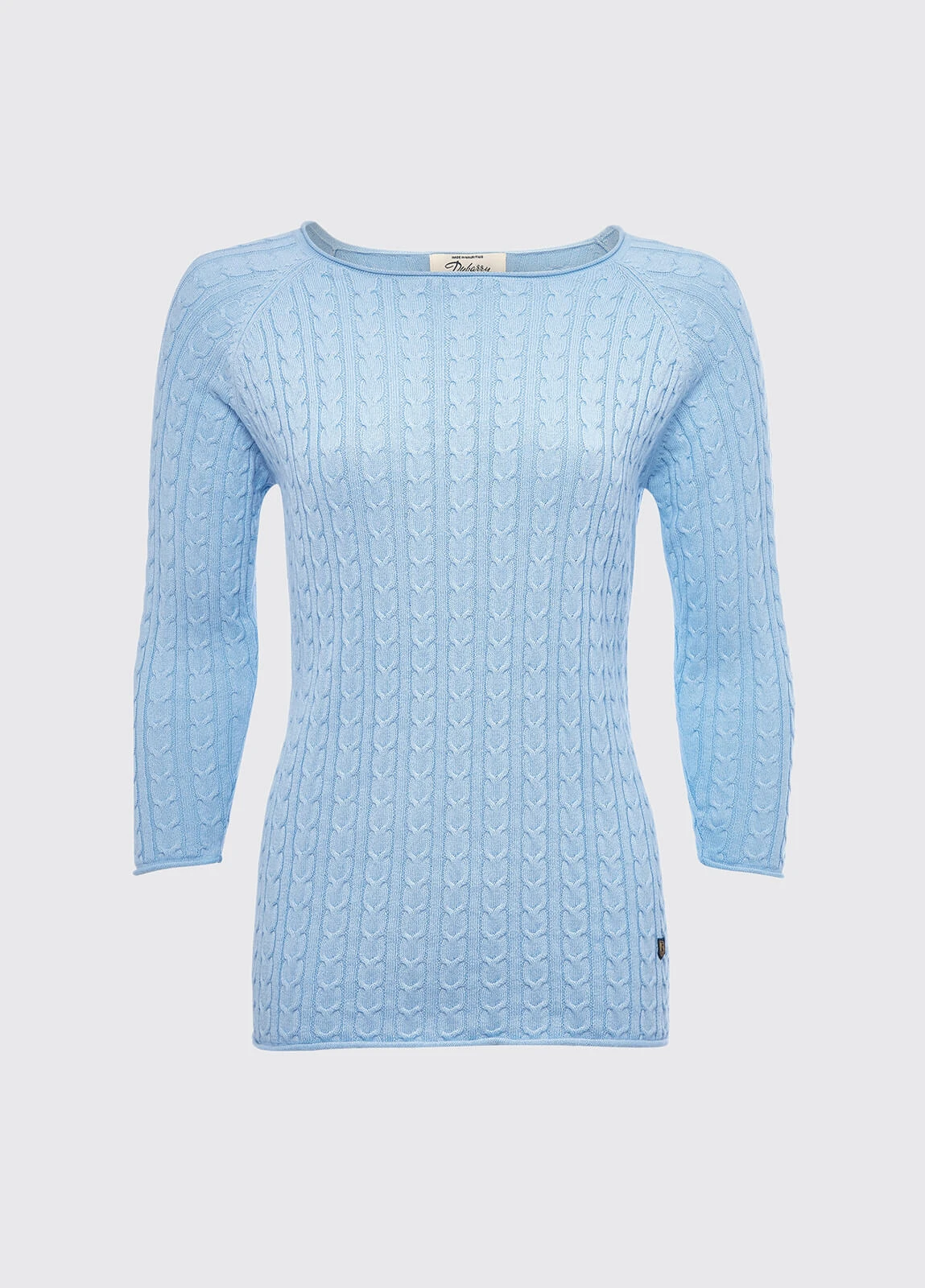 Caltra cable stitch, fine gauge, ladies sweater with scoop neck and ¾ length raglan sleeves. – Cable stitch, fine gauge, ladies sweater with scoop neck and ¾ length raglan sleeves. 80% Cotton, 20% Nylon Machine washable