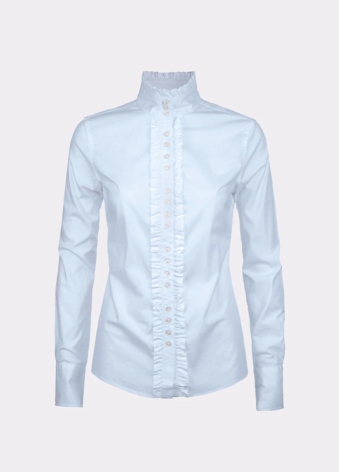 A traditionally inspired shirt, the Chamomile has an elegant style. Ruffle detail along the button fastening runs the full length up to and around the edge of the stand up collar. Team it with Dubarry tweed for a timeless country style or match with skinny jeans, Chelsea boots and a leather jacket for a modern twist.