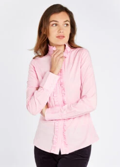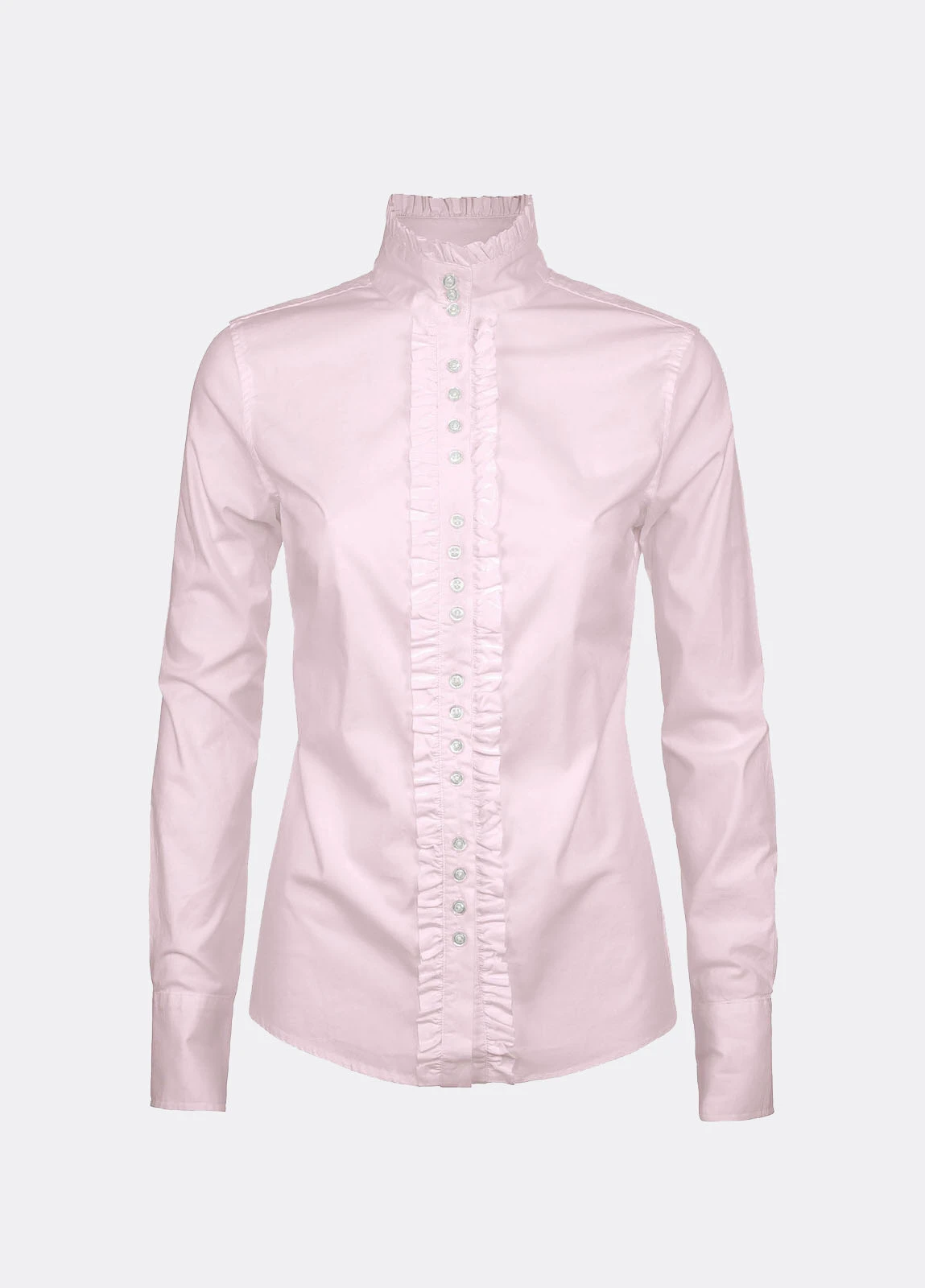 A traditionally inspired shirt, the Chamomile has an elegant style. Ruffle detail along the button fastening runs the full length up to and around the edge of the stand up collar. Team it with Dubarry tweed for a timeless country style or match with skinny jeans, Chelsea boots and a leather jacket for a modern twist.
