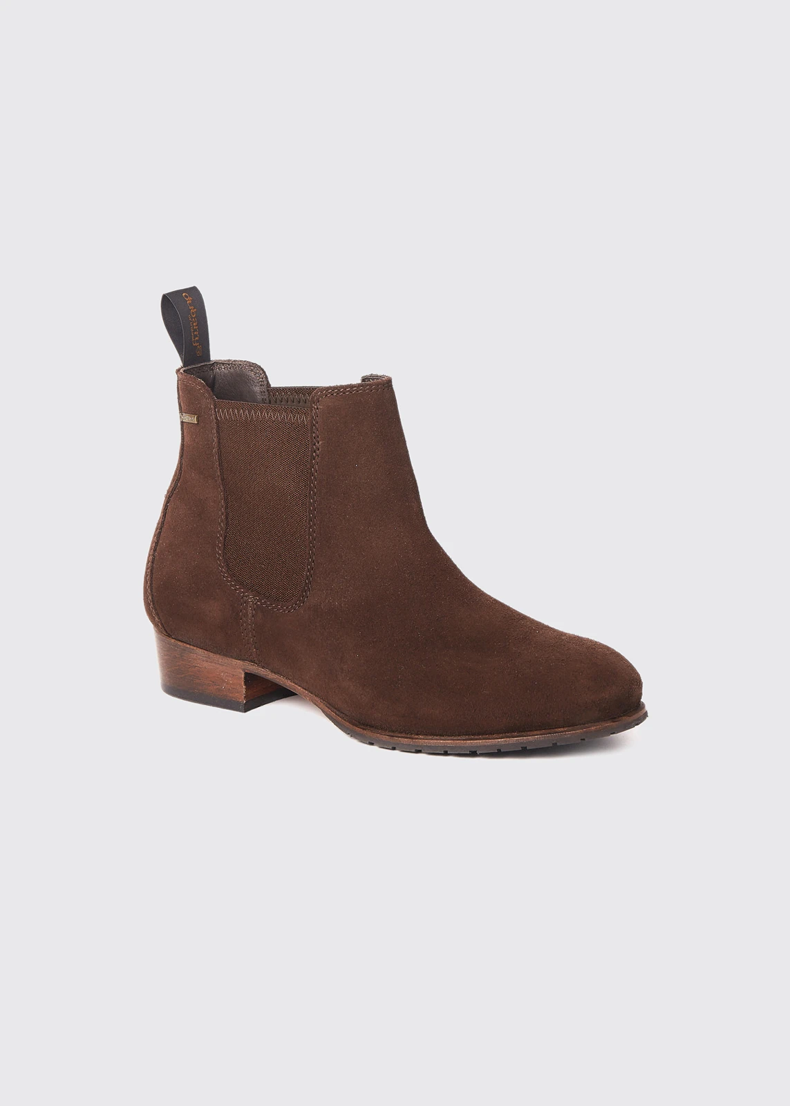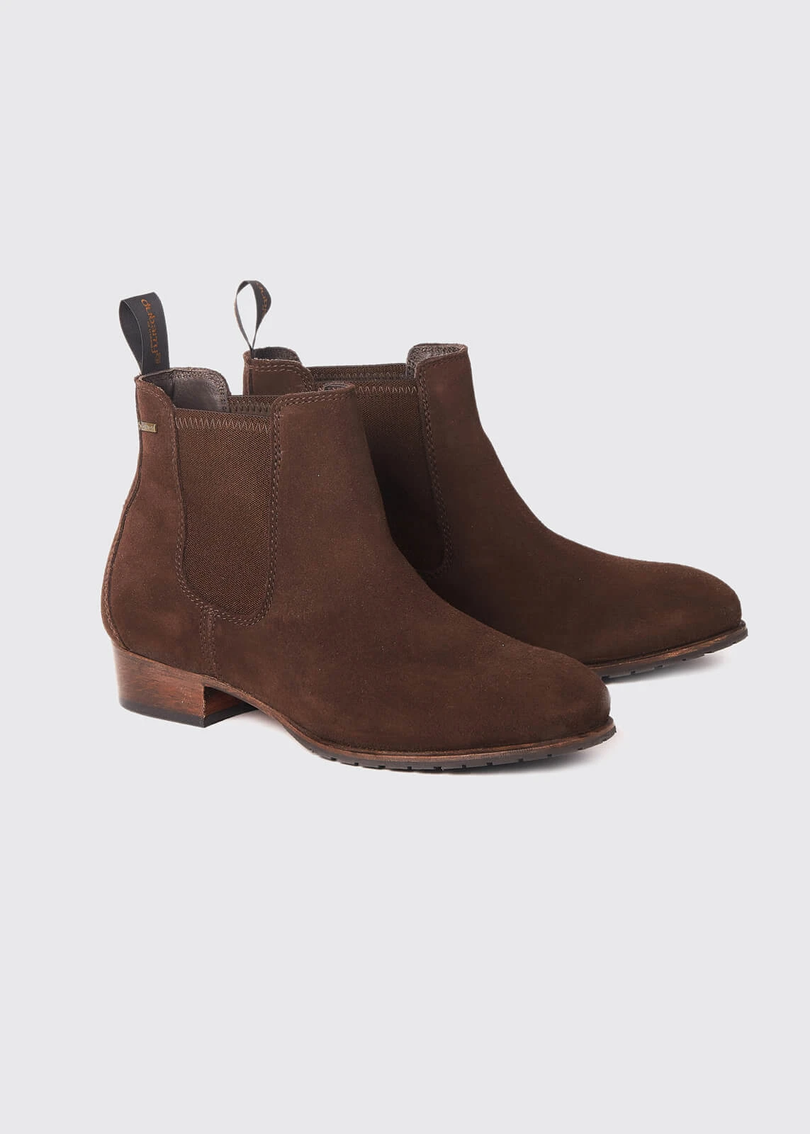 The Dubarry Cork Chelsea boot for women is a slender ankle boot available in suede and leather. Great city boots that also coordinate with your country wardrobe, they combine breathable GORE-TEX technology and a water resistant DryFast-DrySoft™ finish to ensure your feet are warm and dry. Leather and rubber soles with a leather stacked heel give an elegant appearance and matching elasticated paneled sides make for a secure fit. Team with Dubarry fitted jeans and a weatherproof jacket.