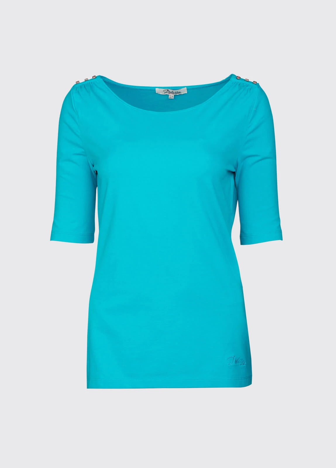 This soft feel women’s top, with scoop neck, shoulder button detail and elbow length sleeves, is perfect for teaming with Dubarry country clothing and Dubarry sailing clothing. A casual top for women, pair Corofin with skinny jeans or women’s shorts or sk – Soft scoop neck, fitted, cotton jersey top, with elbow length sleeves, shirring detail at the shoulder and 3 square buttons to each shoulder. 95% cotton, % Elastane Machine washable