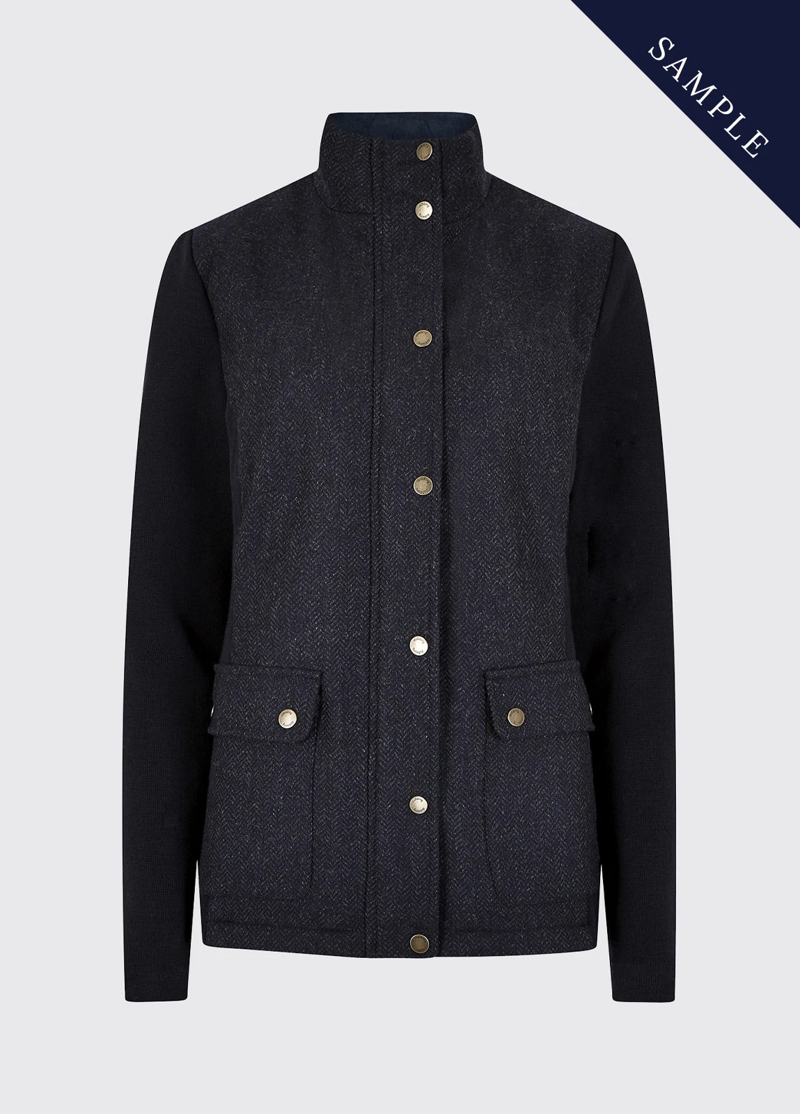 - Tailored tweed with knitwear sleeves