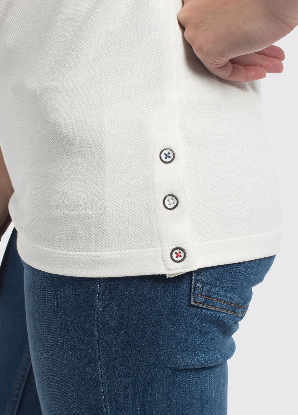 Ladies top Fermoyle, is new to Dubarrys celebrated Womens Clothing Collection. This cowl neck womens top sports dolman sleeves and will coordinate perfectly with sailing clothing and urban outfits for city style. – Luxurious Modal rich, dolman sleeved, cowl neck top, with side seam button detail; crease resistant so ideal holiday wear. 63% Modal, 37% Polyester Machine washable