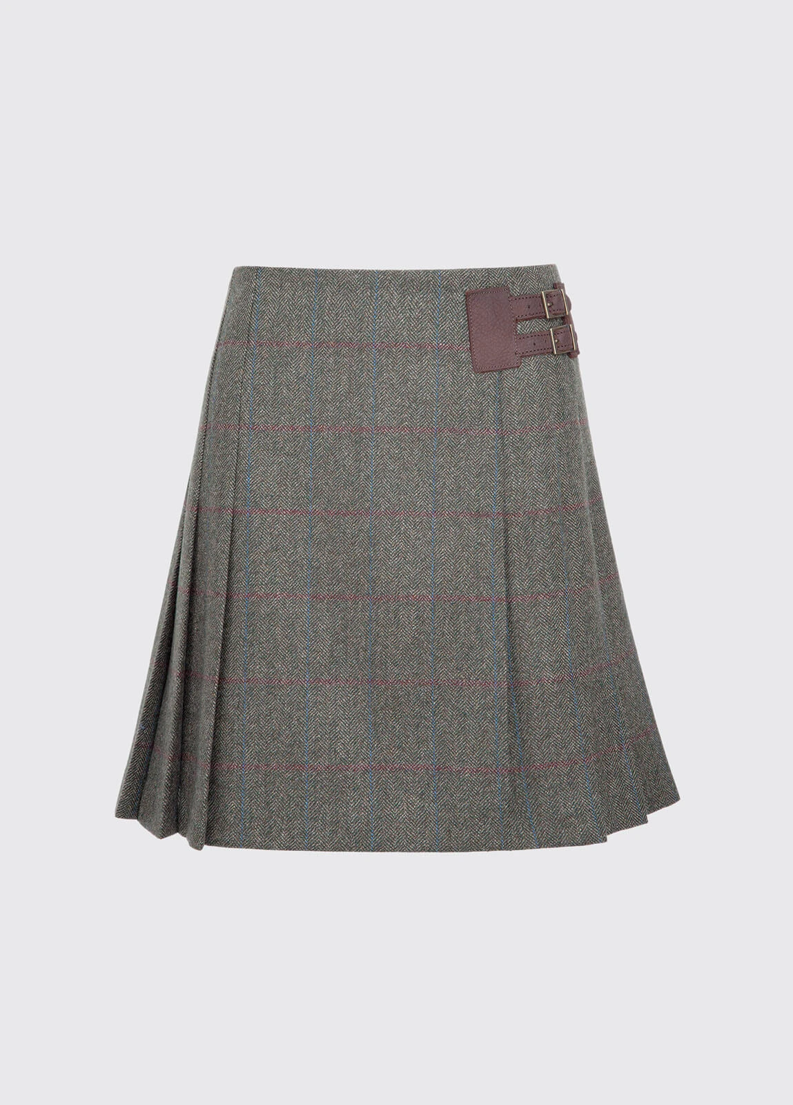 The contemporary short pleated tweed skirt for women has the classic country look and is also ideal as an all-day country casual piece. The stylish pleated skirt looks elegant when styled with a Dubarry womens blouse and tweed blazer. – Teflon coated 100% Pure New Wool Signature Dubarry jacquard lining in contrasting colour Contrast gold colour branding and interior detail Faux wrap style with side split Crushed leather buckle detail