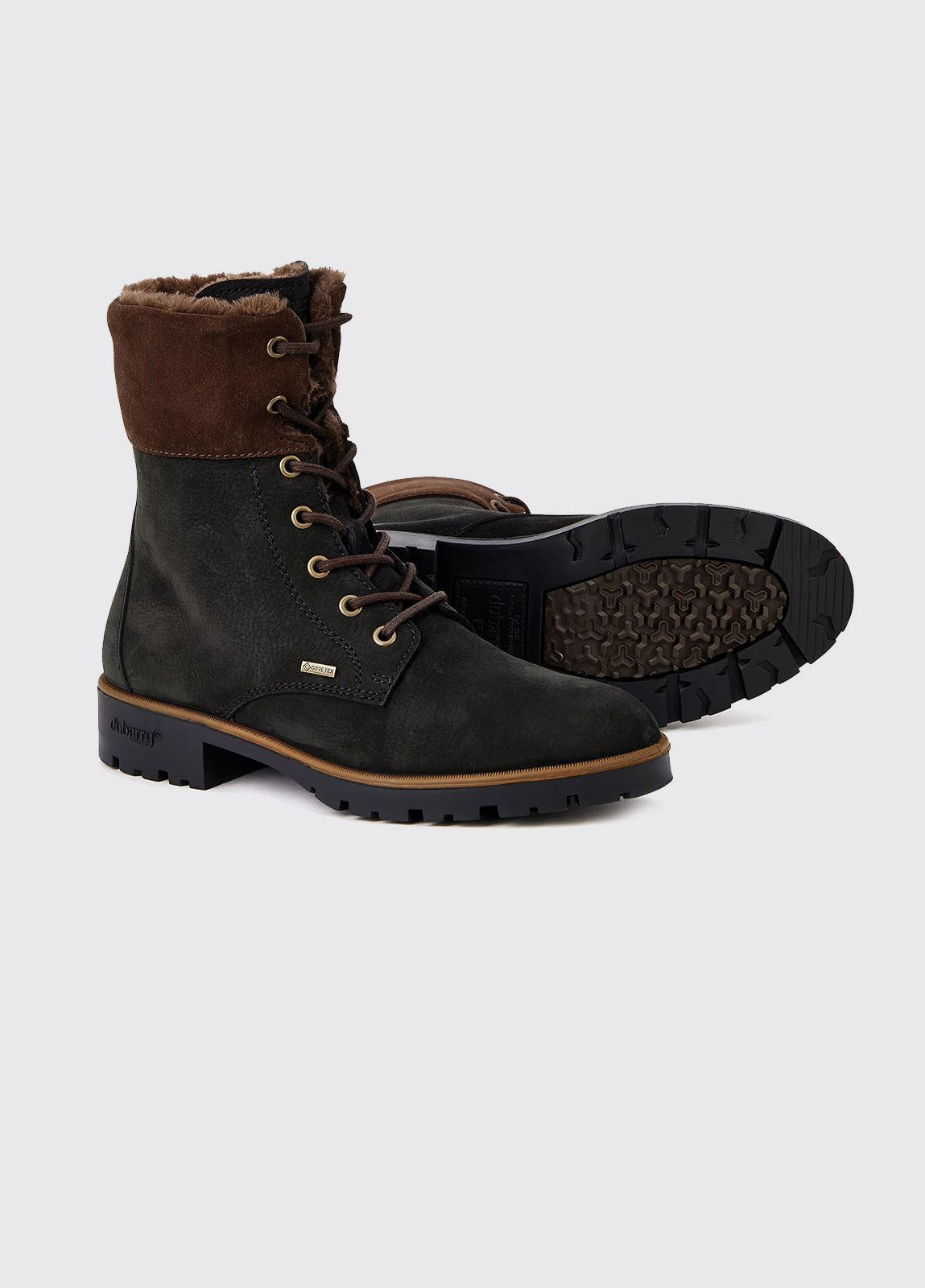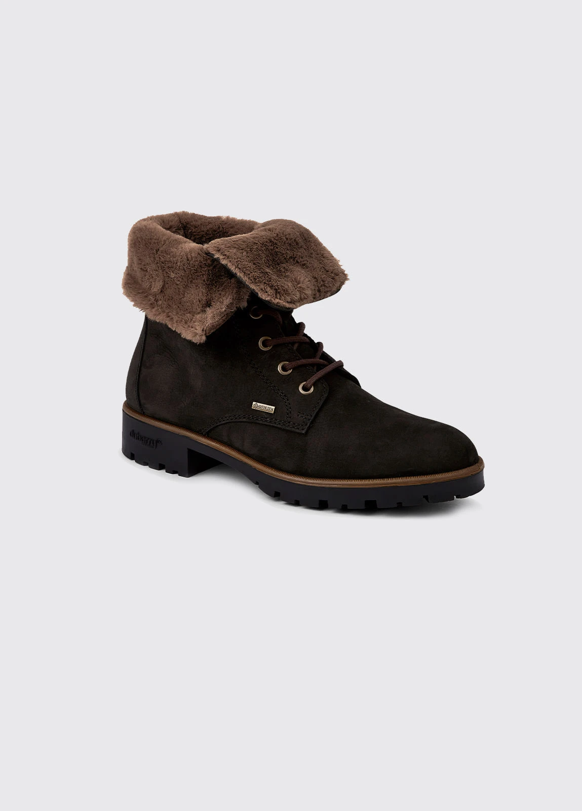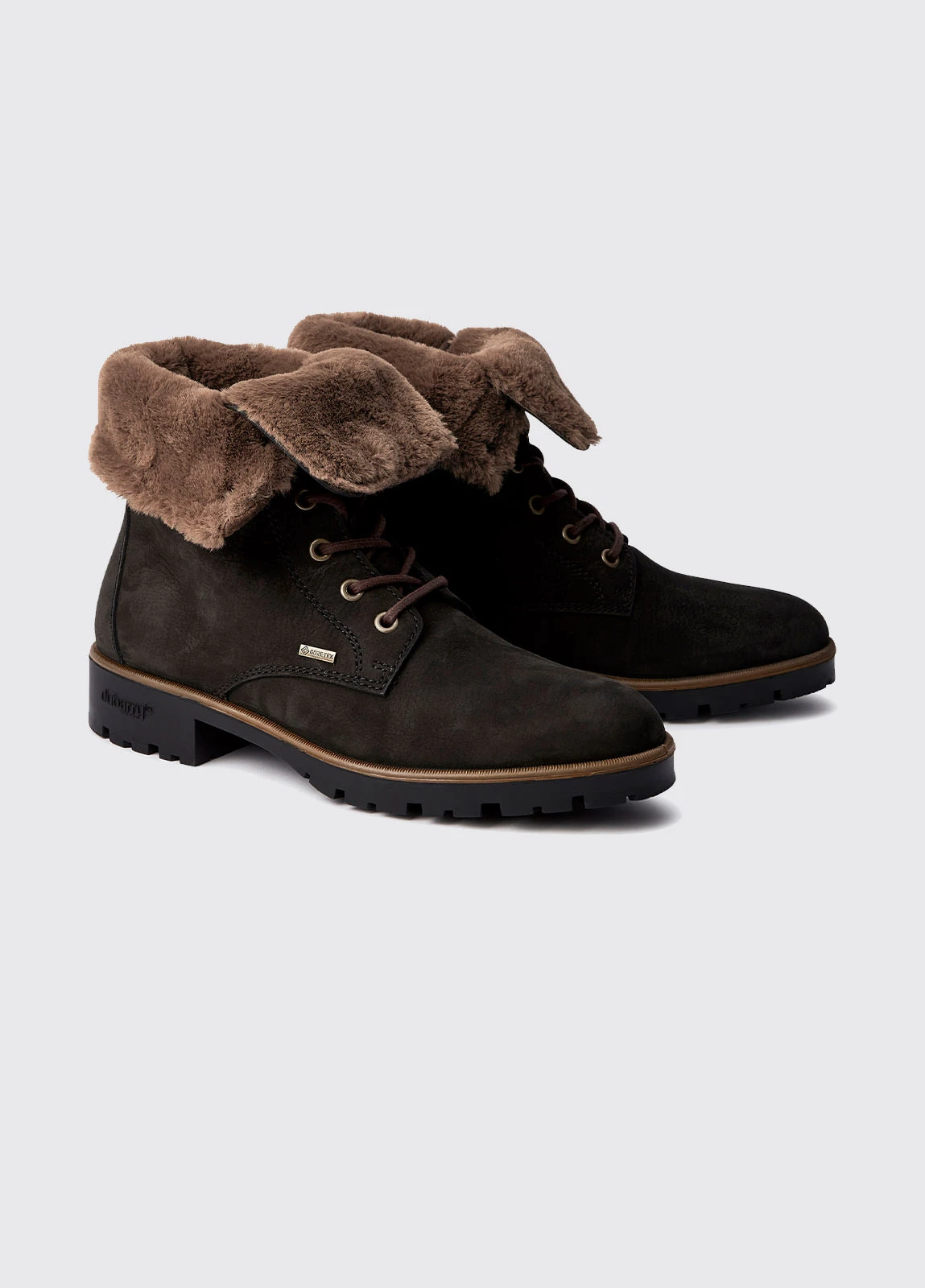 A perfect combination of cosy and rugged, these fold down ankle boots have a biker boot feel but are lined with snuggly faux fur. Packed with weather resistant technology, from Dubarry’s DryFast-DrysoftTM leather and GORE-TEX lining to shock absorbing, gripping soles, they are ideal weekend style with an edge – a great partner to Dubarry leather and wax winter jackets