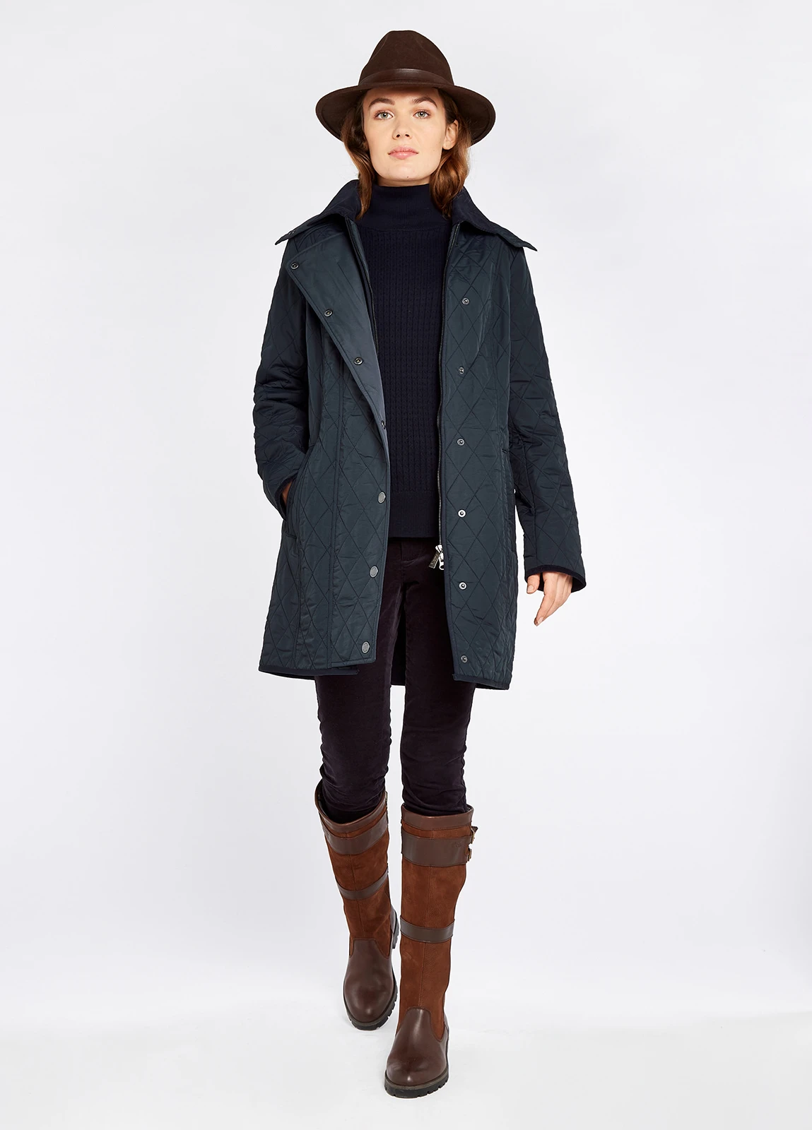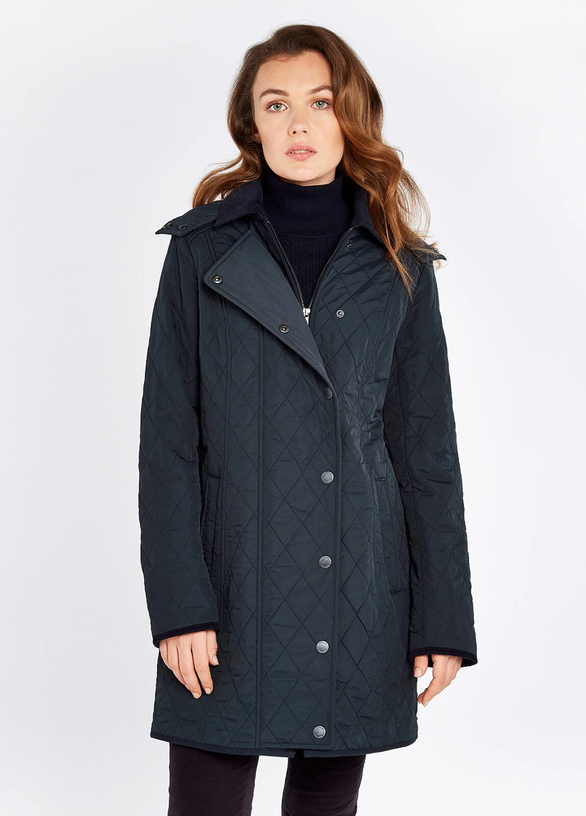 With fleecy lining, warming quilting and a shapely silhouette, you’ll be wrapping yourself up in the Jamestown all winter long. The water repellent, lightweight polyester fabric has toasty handwarmer pockets and a soft corduroy collar and cuff trim. The diamond pattern stitching is complimented by several body seams that give a streamlined flattering style. Match with Dubarry jeans and country boots for total comfort and cosiness.