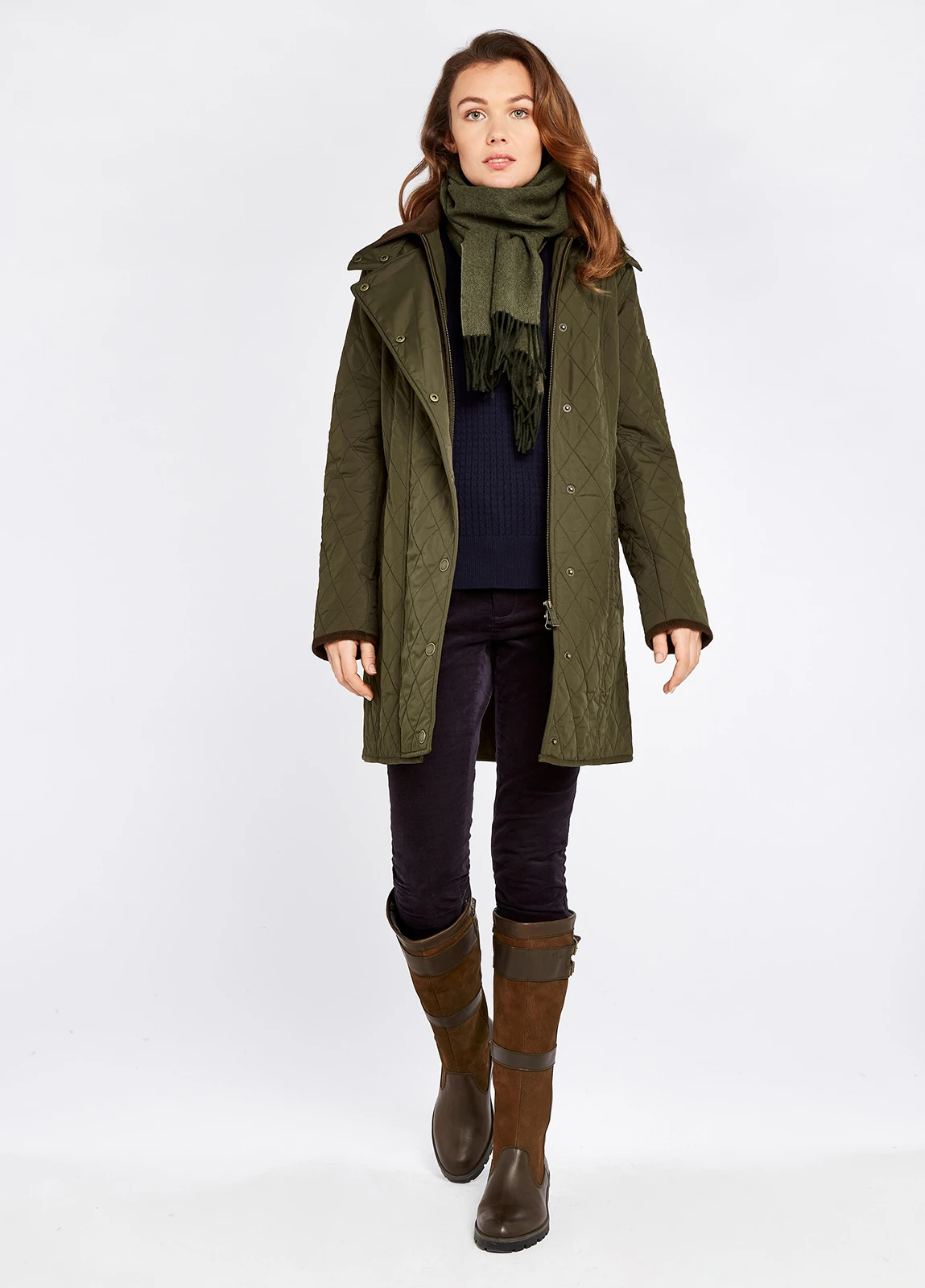 With fleecy lining, warming quilting and a shapely silhouette, you’ll be wrapping yourself up in the Jamestown all winter long. The water repellent, lightweight polyester fabric has toasty handwarmer pockets and a soft corduroy collar and cuff trim. The diamond pattern stitching is complimented by several body seams that give a streamlined flattering style. Match with Dubarry jeans and country boots for total comfort and cosiness.