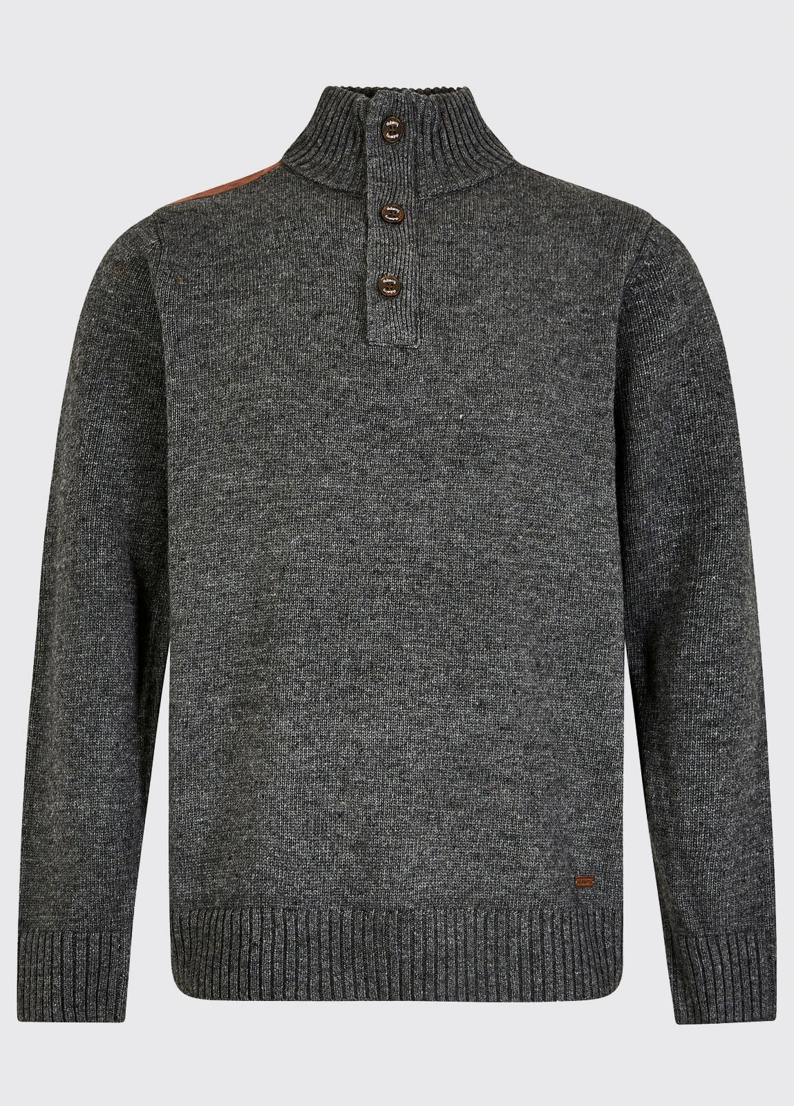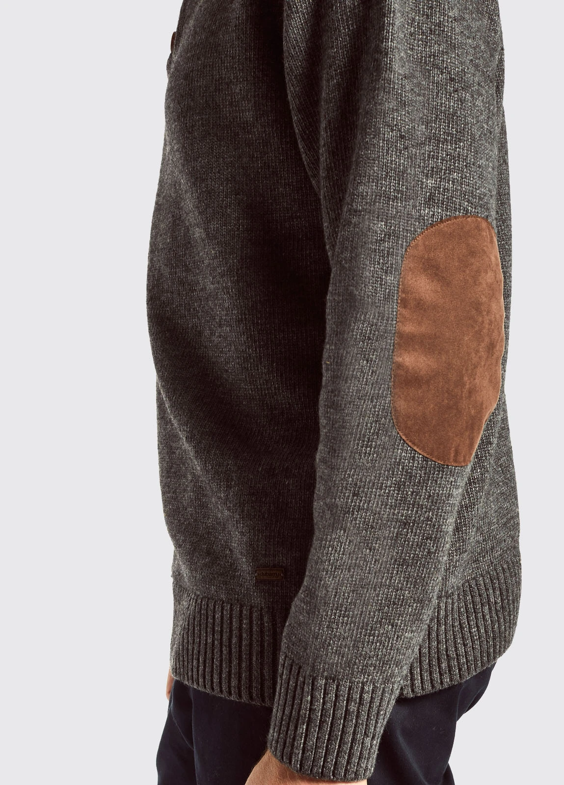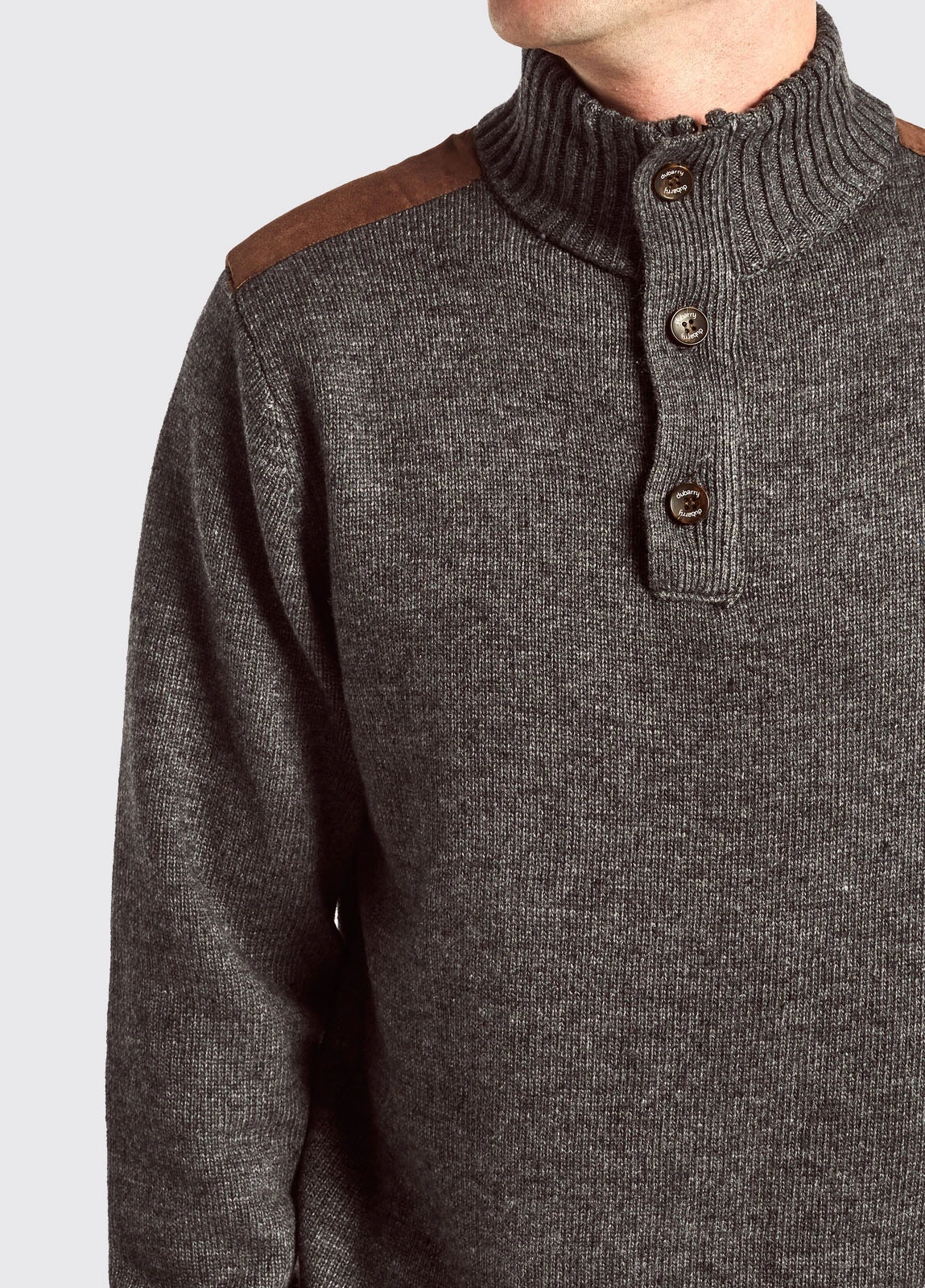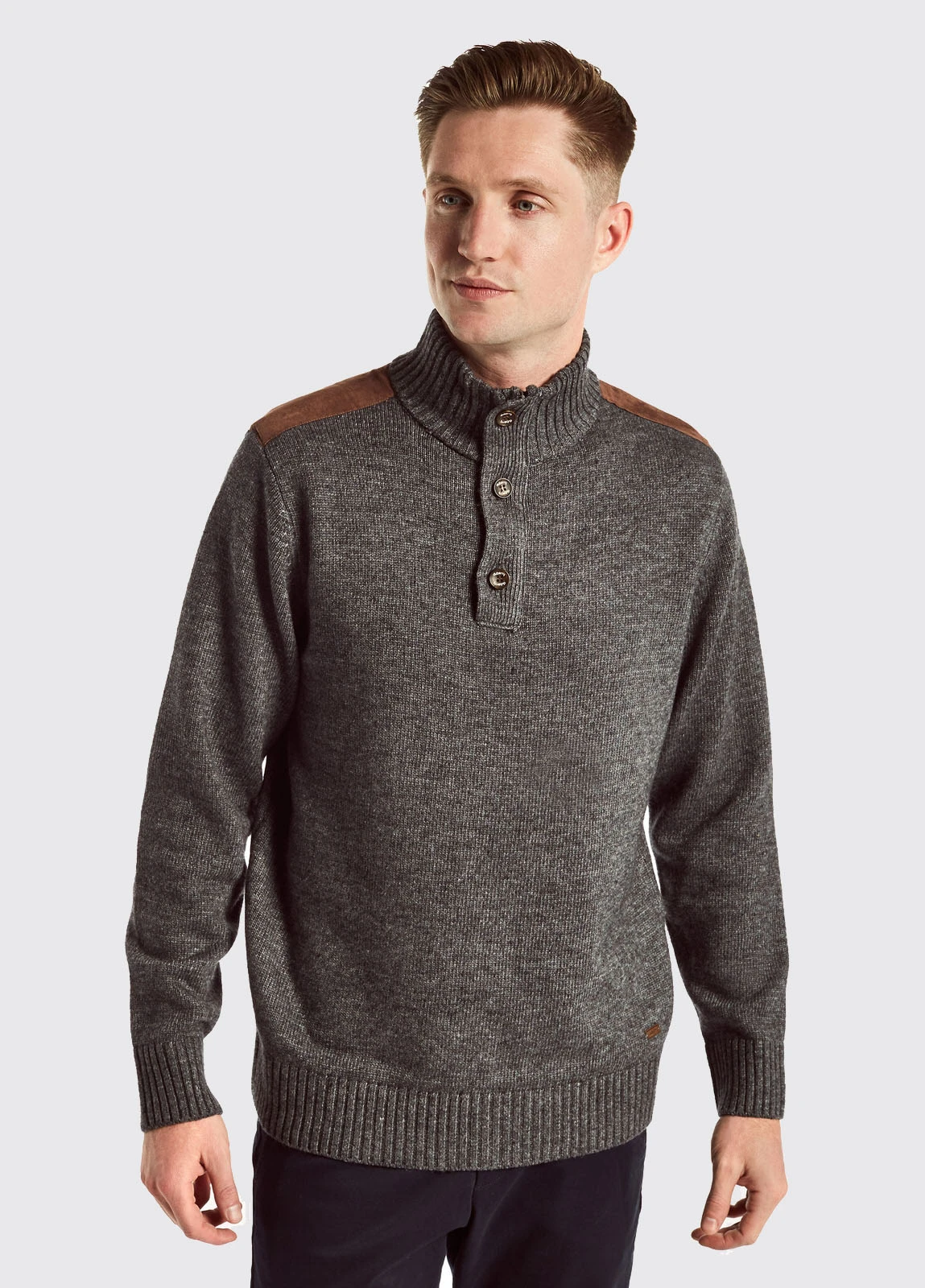 With faux suede collar and cuffs and three button fastening collar, the Lambert has classic country style and made with a soft wool blend will be a firm winter wardrobe favourite. Wear with chinos or jeans and Dubarry boots for simple, relaxed warm winter style. – Half zip sweater in wool blend with faux suede patches.