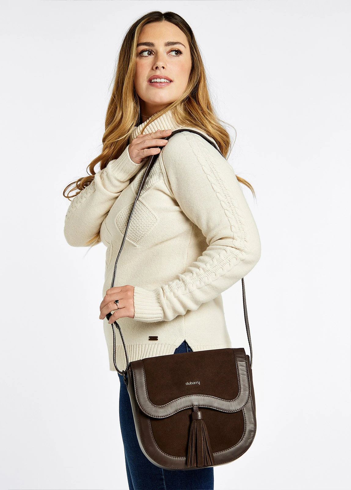 Compact, smart and just the size for your essentials, the Monart saddle bag is made with a combination of suede and leather,which coordinate beautifully with the Dubarry footwear range. With a useful, adjustable cross body strap it also leaves you hands free for the essentials, like race cards, bonfire night sparklers and festive mince pies.