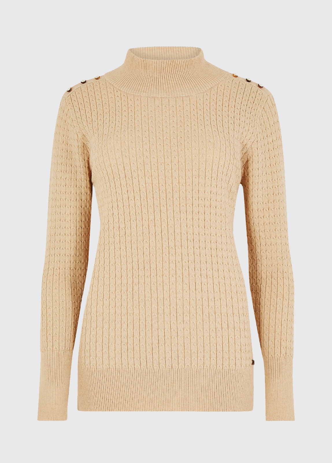 A real capsule piece, our Monkstown sweater has fantastic versatility as well as super soft comfort. An intricate cable stich pattern gives a real touch of class, finished with pearl buttons on each shoulder. Elevate your weekend style by matching with your favourite jeans and Chelsea boots or team with a Dubarry tweed skirt and long length boots for a professional touch