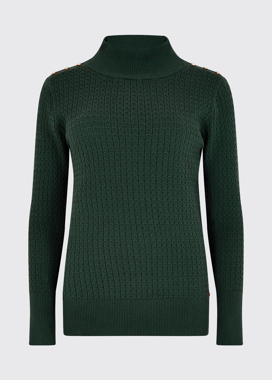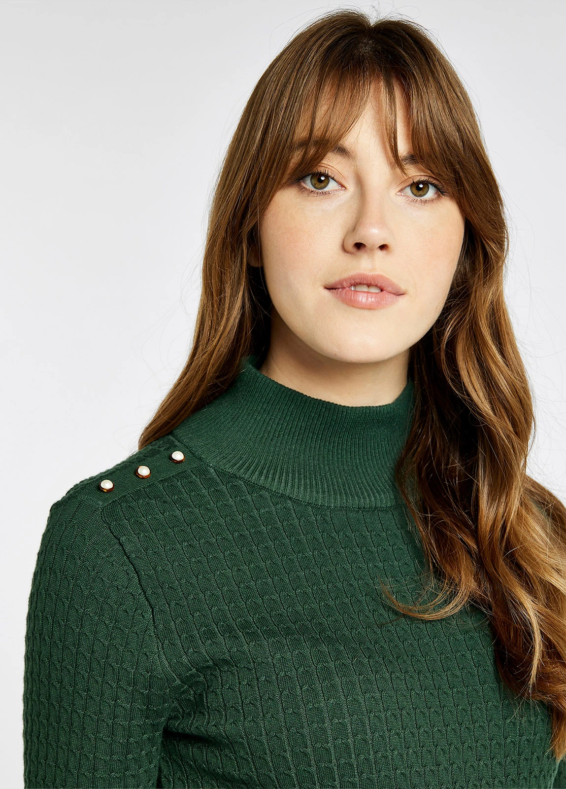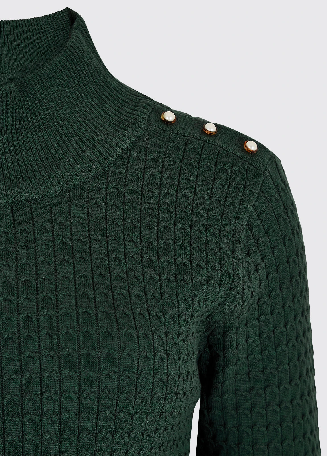 A real capsule piece, our Monkstown sweater has fantastic versatility as well as super soft comfort. An intricate cable stich pattern gives a real touch of class, finished with pearl buttons on each shoulder. Elevate your weekend style by matching with your favourite jeans and Chelsea boots or team with a Dubarry tweed skirt and long length boots for a professional touch