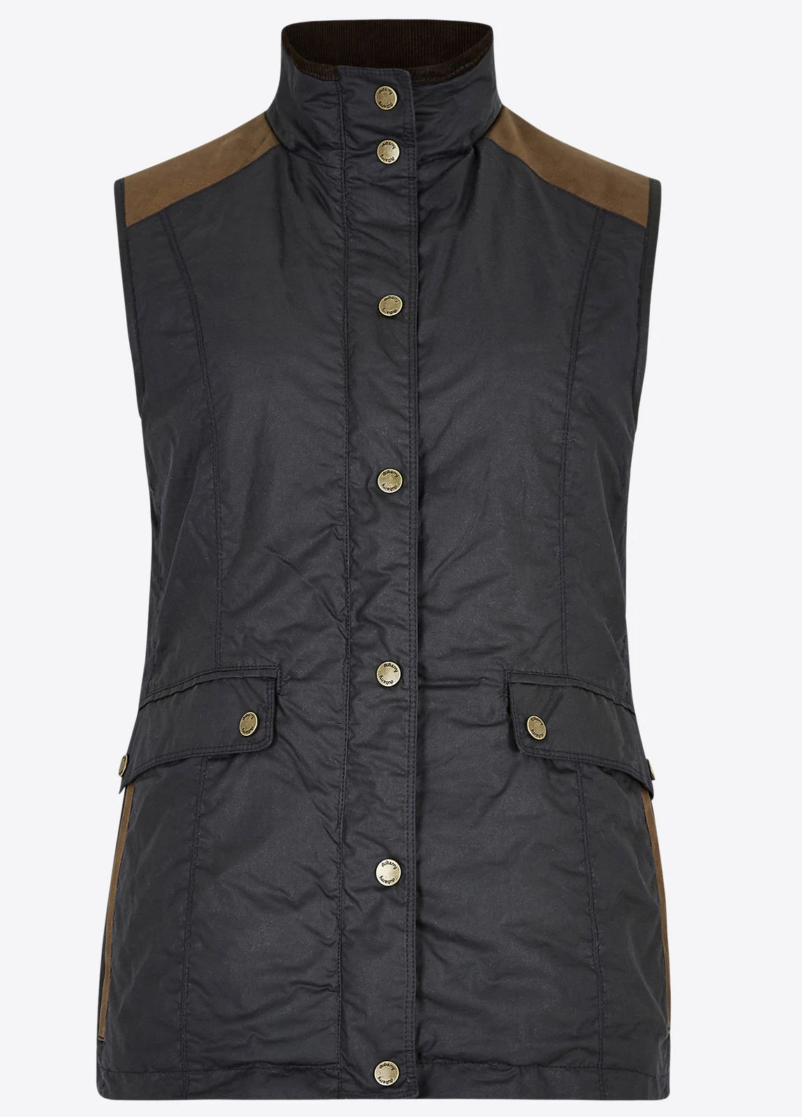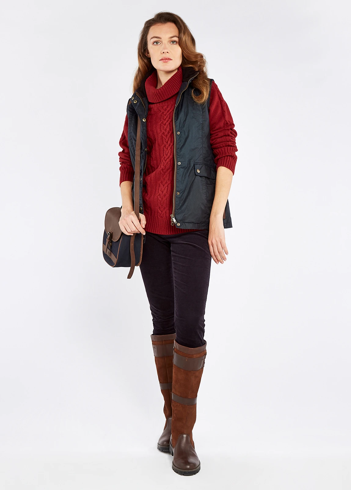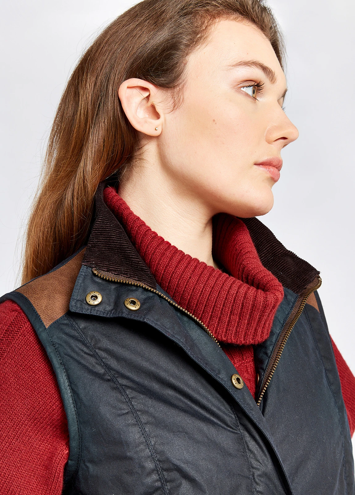 The Pembroke gilet has a water repellent waxed outer layer and a warming PrimaLoft® filling inside. The shoulder panels and collar have leather details and the collar is lined with comfy corduroy. Gently tailored it gives a fitted silhouette and is perfect for layering with a Dubarry knit on crisper autumnal days.