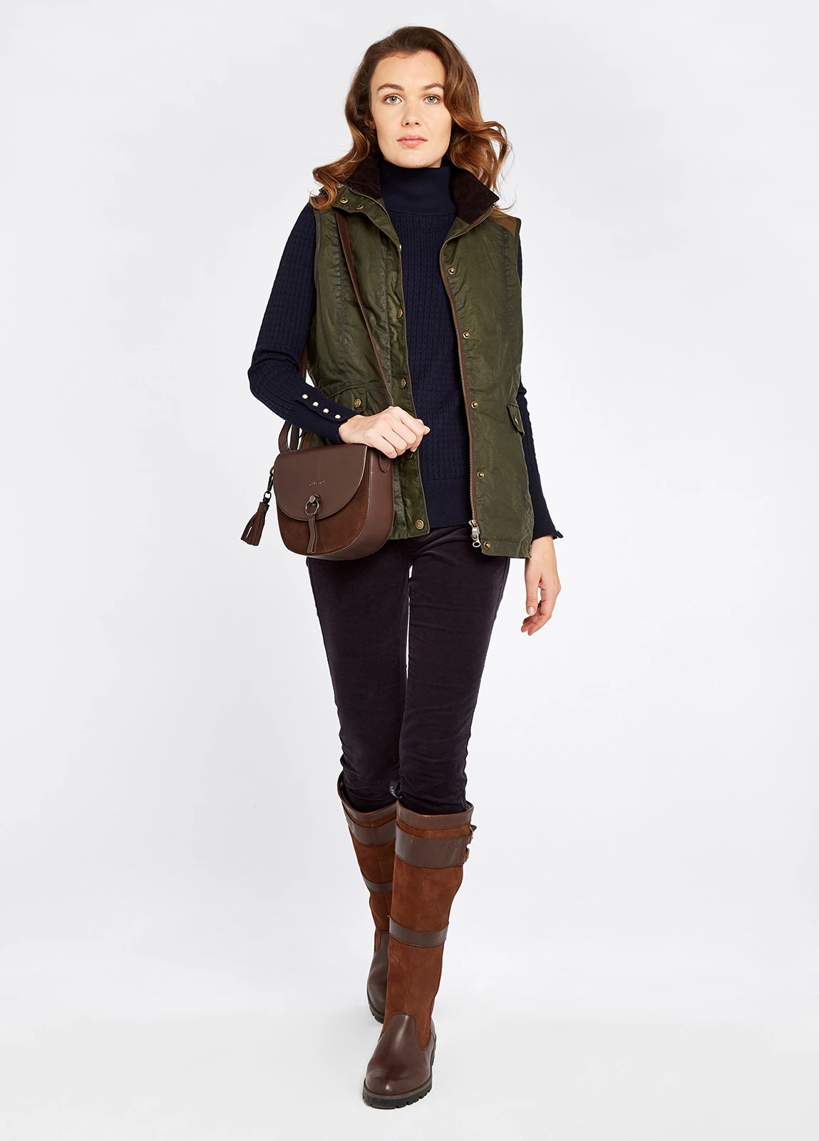 The Pembroke gilet has a water repellent waxed outer layer and a warming PrimaLoft® filling inside. The shoulder panels and collar have leather details and the collar is lined with comfy corduroy. Gently tailored it gives a fitted silhouette and is perfect for layering with a Dubarry knit on crisper autumnal days.