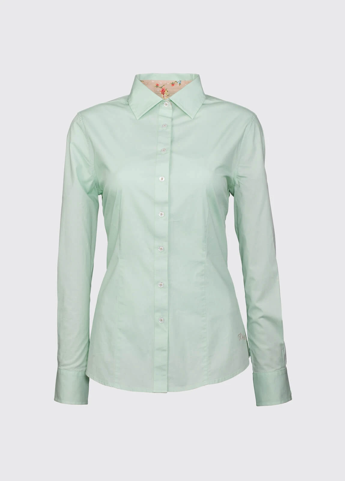 A fitted shirt with colourful contrast floral print trim, Petunia demonstrates high quality shirt making, with French seams, clean finished hems and barrel cuffs, complete with buttoned sleeve placket. An additional button detail above the elbow stitching.