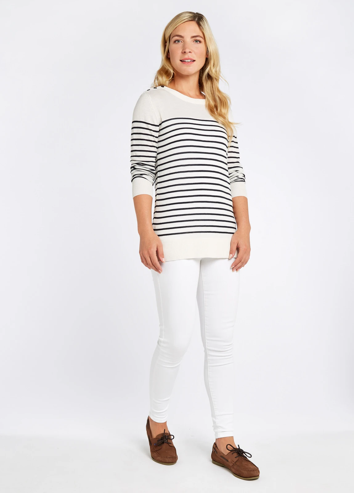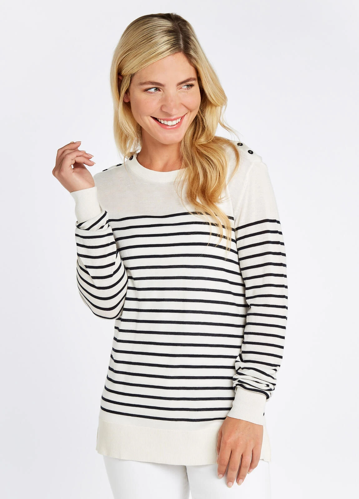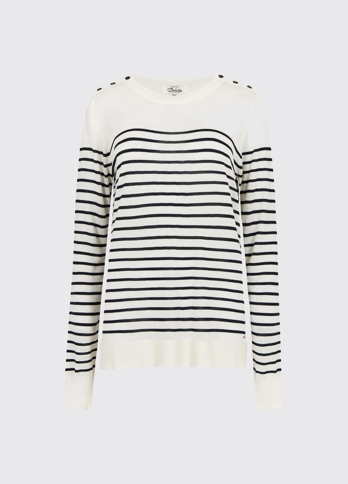 Nautical and nice, the Portlaw sweater has classic Breton stripes in a unique Dubarry design. Light, wrinkle resistant fabric is cut in a flattering straight style with long sleeves and each shoulder fastens with three buttons and it comes in three colour variations, great for summer strolling or bracing seaside breezes.
