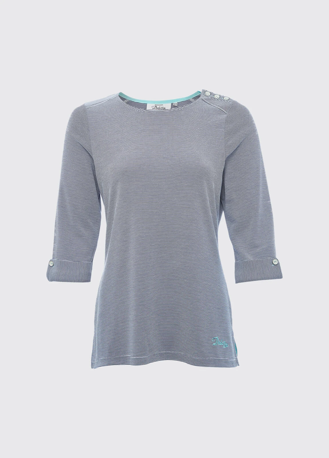Dubarry portmagee mini-stripe, scoop neck top with functional button detail on shoulder and cuffs and ¾ length sleeves in soft, luxurious fabric.