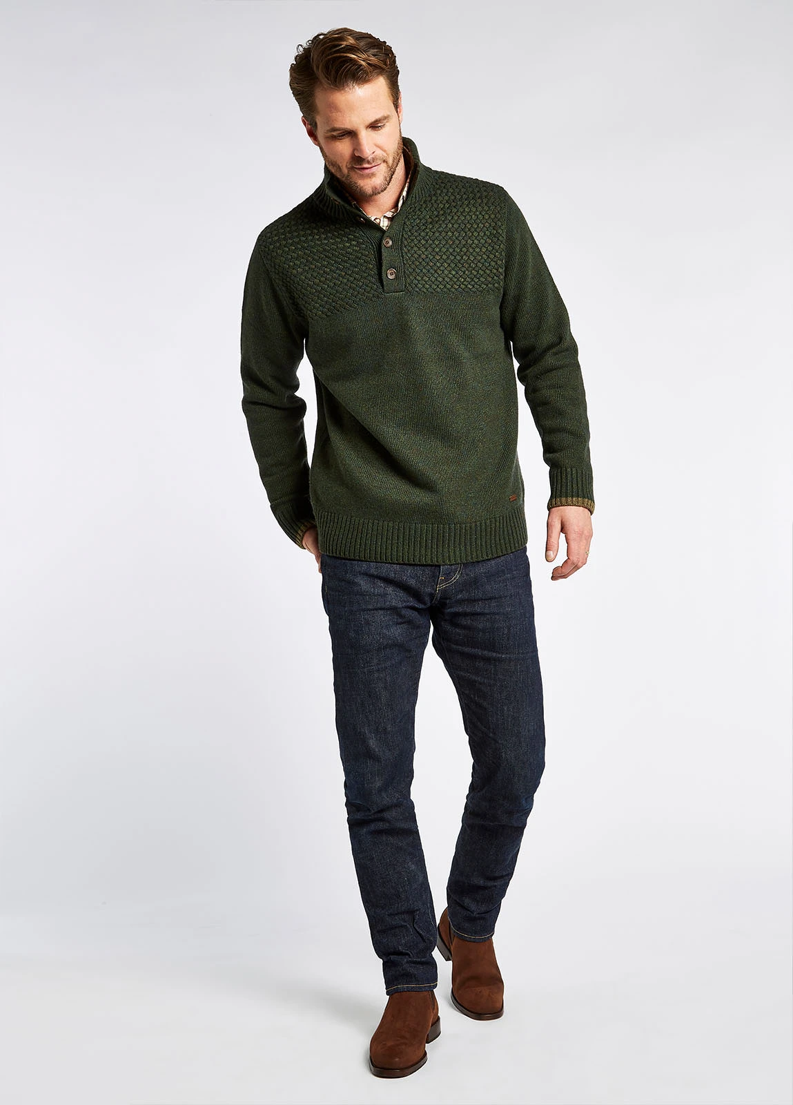Made in breathable, soft, durable fabric and knitted with a striking Lattice stitch panel across the chest, whether you’re having a shooting day, a rugby day or a sit-by-the fire-and-snooze day, the Roundwood is the sweater for you.